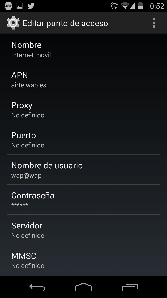 Después de consultar los post que acabo de citar como en mi caso el APN que tengo es airtelwap.es mi contraseña es wap125.