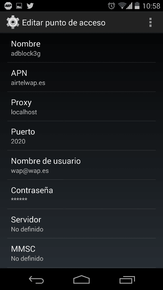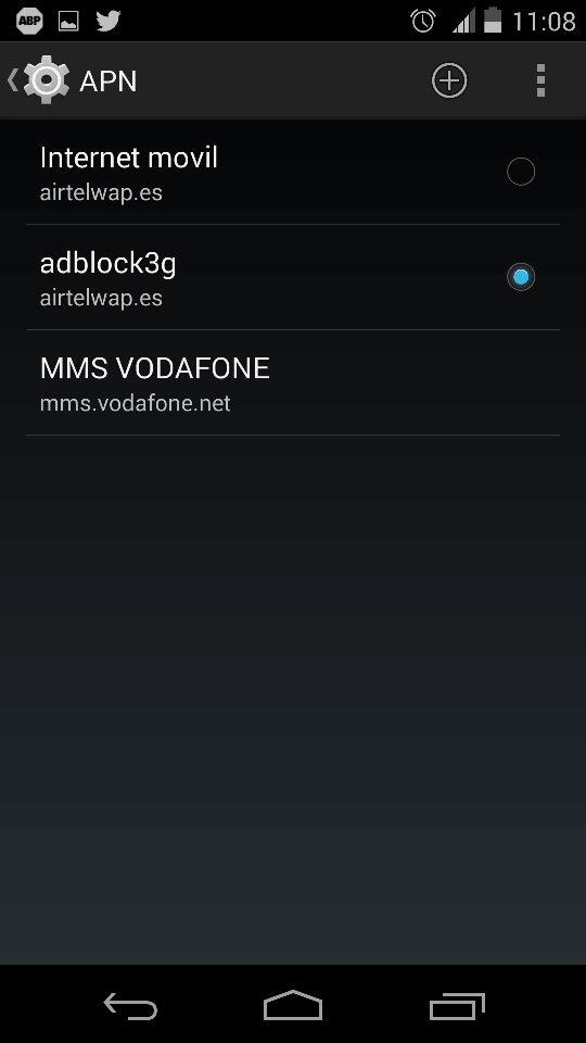 Nombre: Elegir uno cualquiera que sea diferente del actual APN. En mi caso como se puede ver en la captura de pantalla he elegido adblock3G.