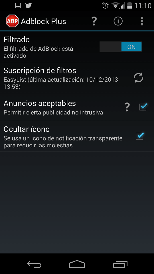 Una vez realizados los pasos mencionados ya tenemos Adblock Plus instalado en nuestro teléfono. Ahora tan solo nos falta configurarlo para que pueda bloquear la totalidad de la publicidad.