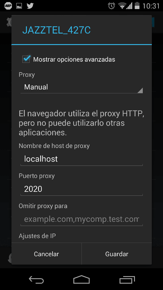 Hola, cuando modifico el host y el puerto no me lo deja guardar mi LG G2. ¿Cuál es el motivo? en mi WIFI en seguridad dice WPA PSK y en ajuste de IP dice DHCP. ¿Alguien sabe como lo debo hacer para que me deje guardar la configuración manual del proxy?