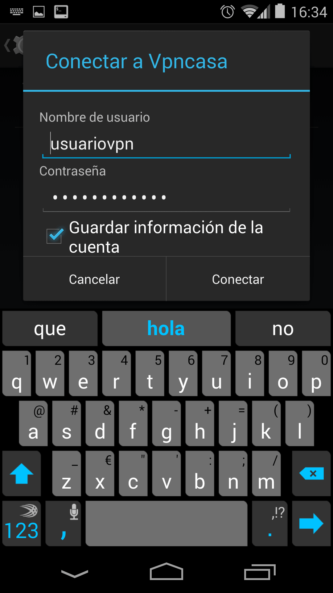 Presionamos encima del VPN “Vpncasa” que acabamos de introducir y seguidamente, y como se puede ver en la captura de pantalla se nos preguntará nuestro usuario y contraseña: