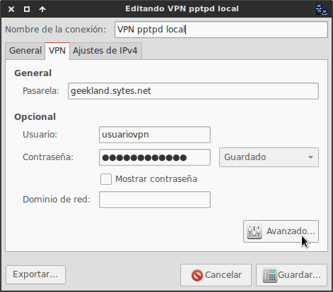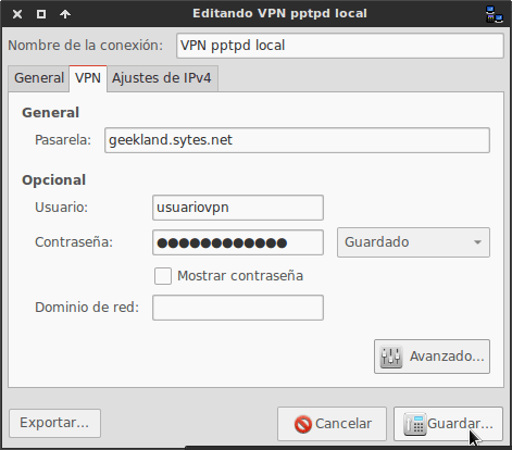 En Nombre podemos elegir el que más nos guste. En tipo de servidor tenemos que seleccionar la opción PPTP y finalmente en dirección del servidor lo único que tenemos que poner es la IP pública de nuestro servidor. En nuestro caso hemos asociado la IP pública de nuestro servidor al dominio geekland.sytes.net. Por lo tanto pondremos geekland.sytes.net.