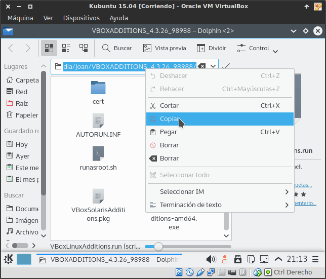 Una vez abierto el gestor de archivos y podamos visualizar el contenido del CD de las Guest Additions, tenemos que presionar la combinación de teclas Ctrl + L. Una vez presionada la combinación de teclas Ctrl + L, tal y como se puede ver en la captura de pantalla, nos aparecerá la dirección/ubicación de las Guest Additions. Tal y como se puede ver en la captura de pantalla la seleccionamos y las copiamos en el portapapeles.